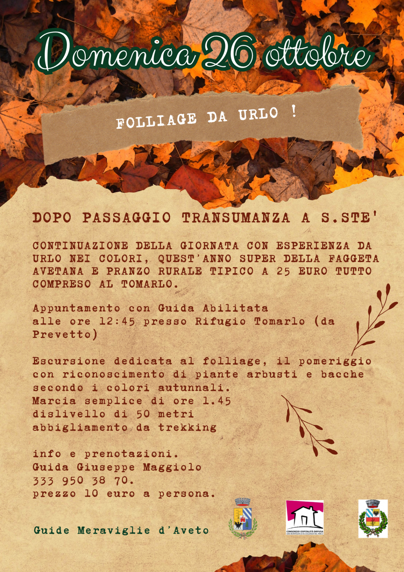 Dopo il tradizionale passaggio della transumanza a Santo Stefano d’Aveto, la giornata prosegue con una suggestiva escursione dedicata ai colori dell’autunno: “Foliage da Urlo”, un’esperienza unica tra le faggete avetane in compagnia delle Guide Meraviglie d’Aveto.