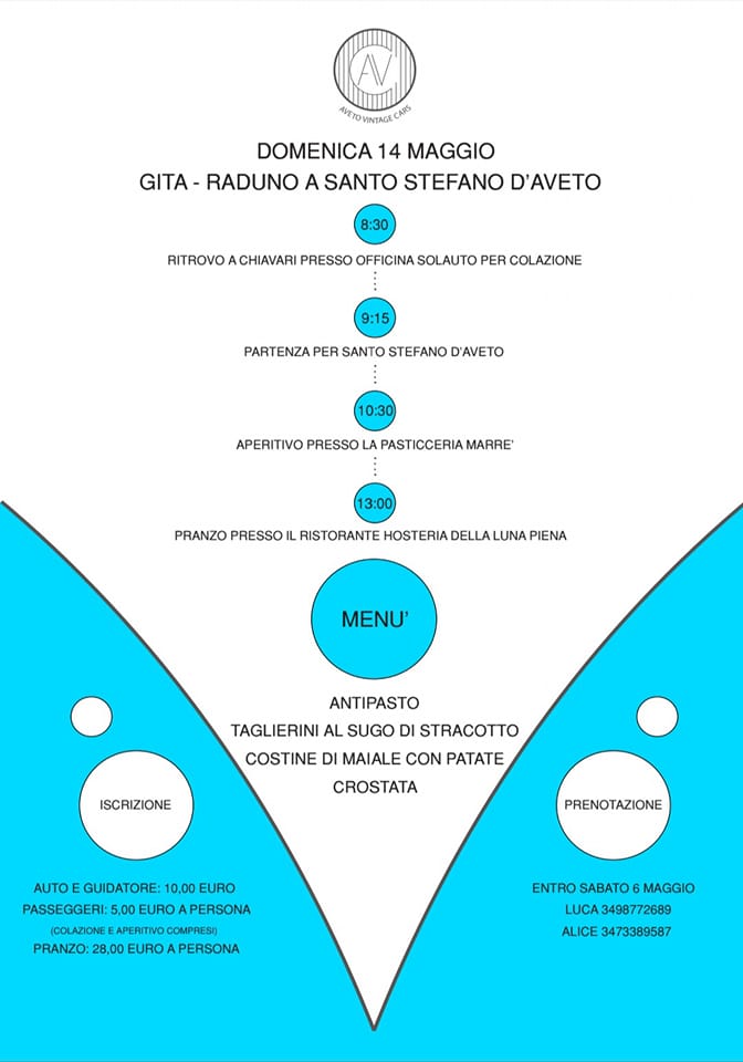 Prenotazioni entro il 6 maggio a Luca: 3498772689 o Alice: 3473389587