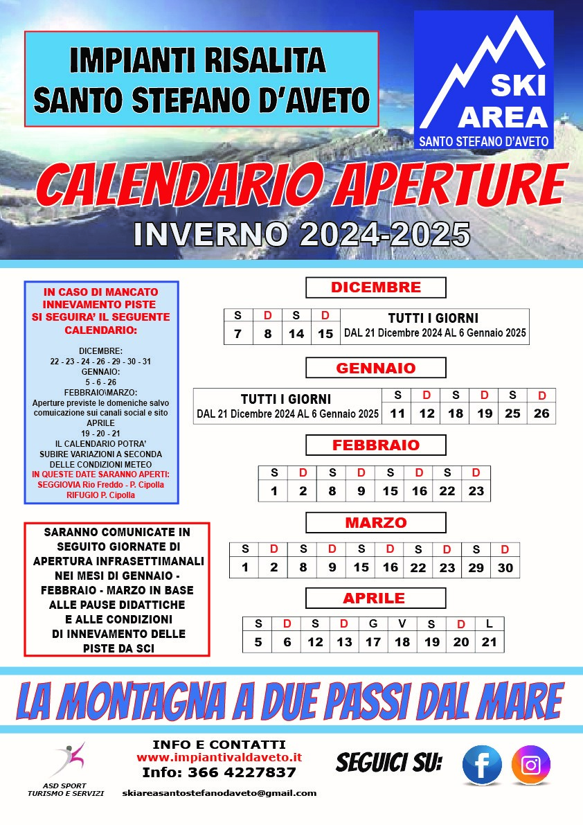 Saranno comunicate in seguito giornate di apertura infrasettimanali nei mesi di gennaio-febbraio- marzo in base alle pause didattiche e alle condizioni di innevamento delle piste da sci
