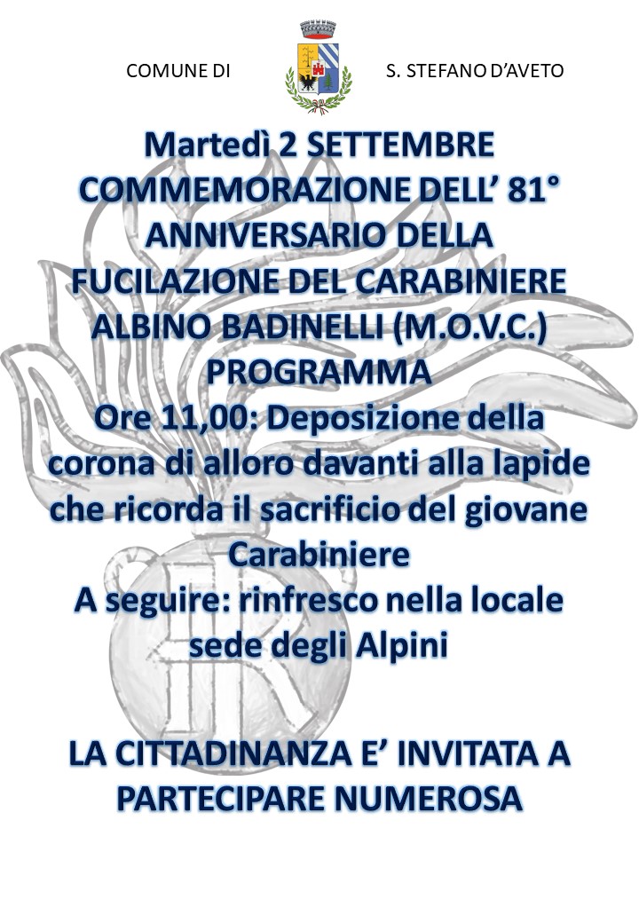 Il 2 settembre 2025 il Comune di Santo Stefano d’Aveto ricorderà il sacrificio del giovane Carabiniere Albino Badinelli, insignito della Medaglia d’Oro al Valor Civile, in occasione dell’81° anniversario della sua fucilazione.