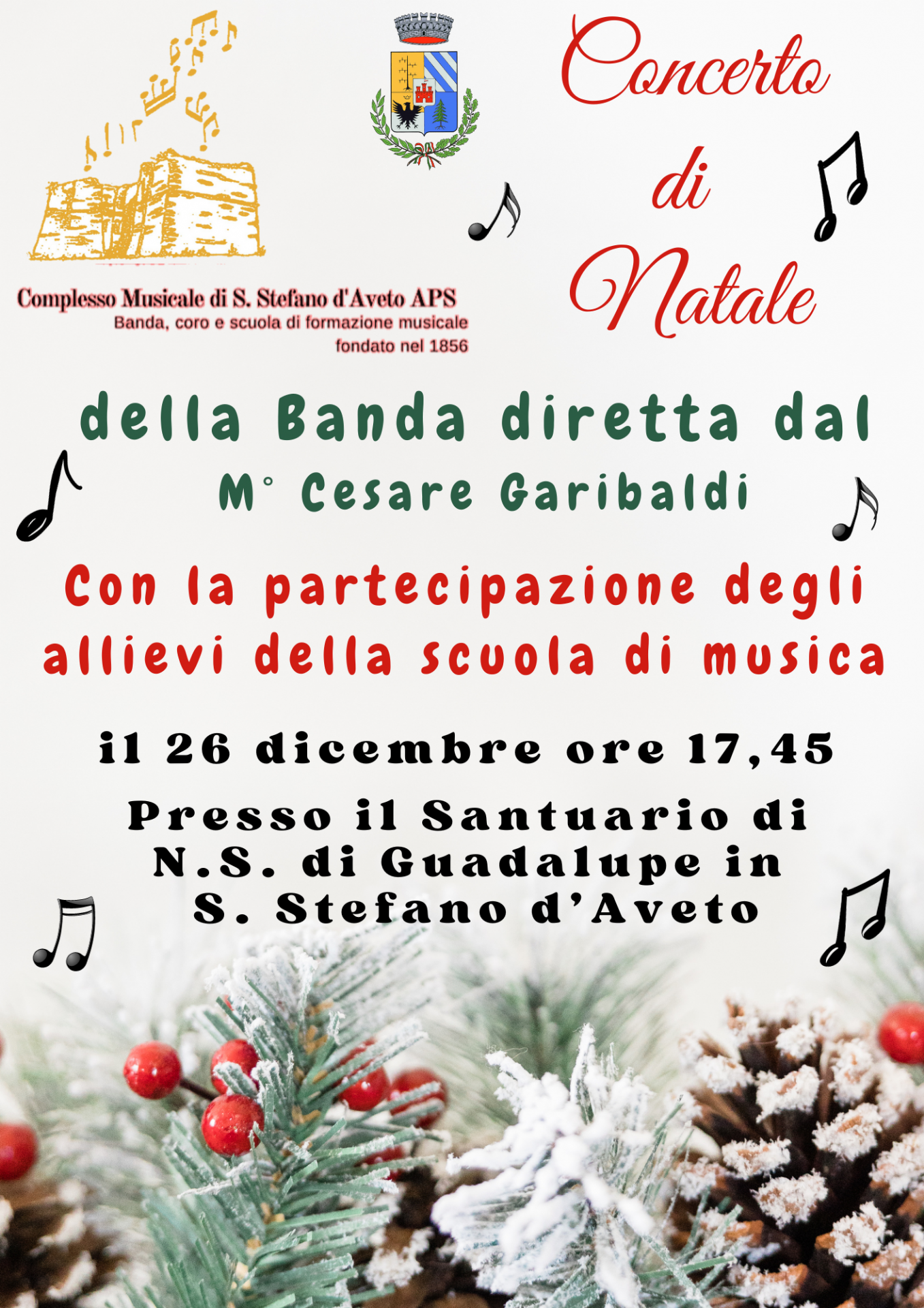 La Banda del Complesso Musicale di S. Stefano d'Aveto APS e gli allievi della Scuola di Musica vi danno appuntamento a martedì 26 dicembre alle 17.45 per il Concerto di Natale presso il Santuario di NS di Guadalupe.