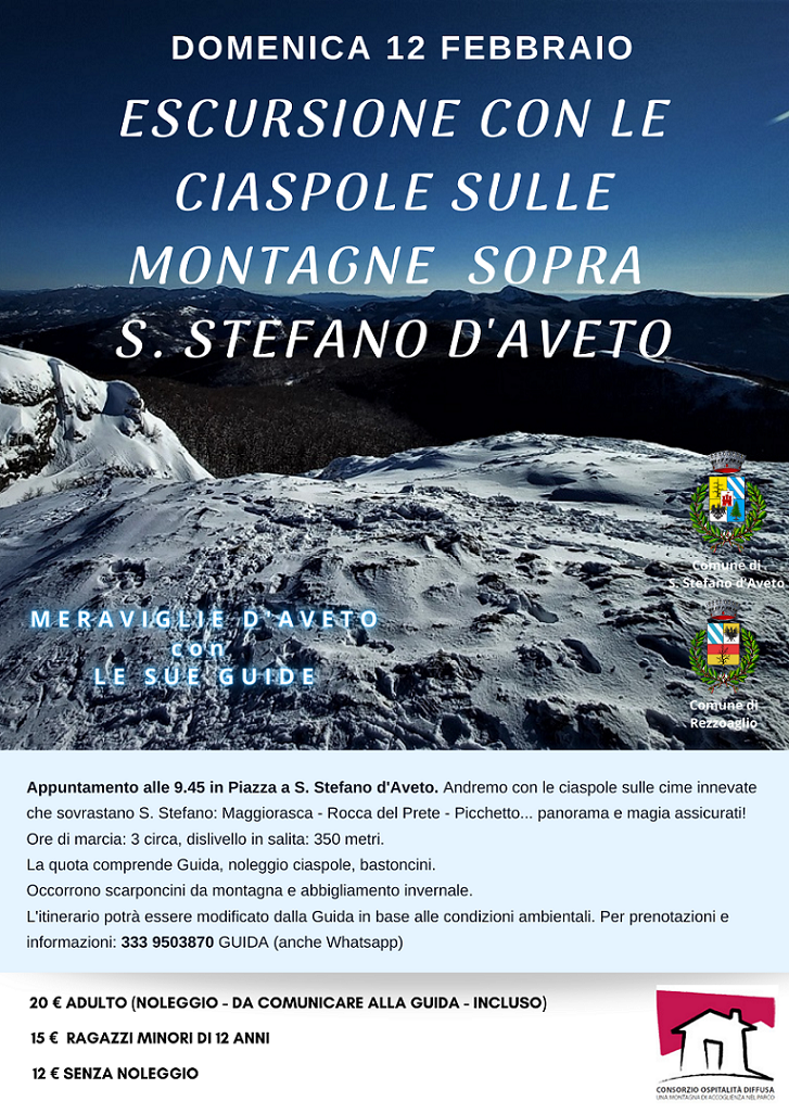 Costo 20€ adulti (comprensivo di noleggio ciaspole da comunicare alla guida), 15€ minori di 12 anni, 12€ senza noleggio ciaspole.