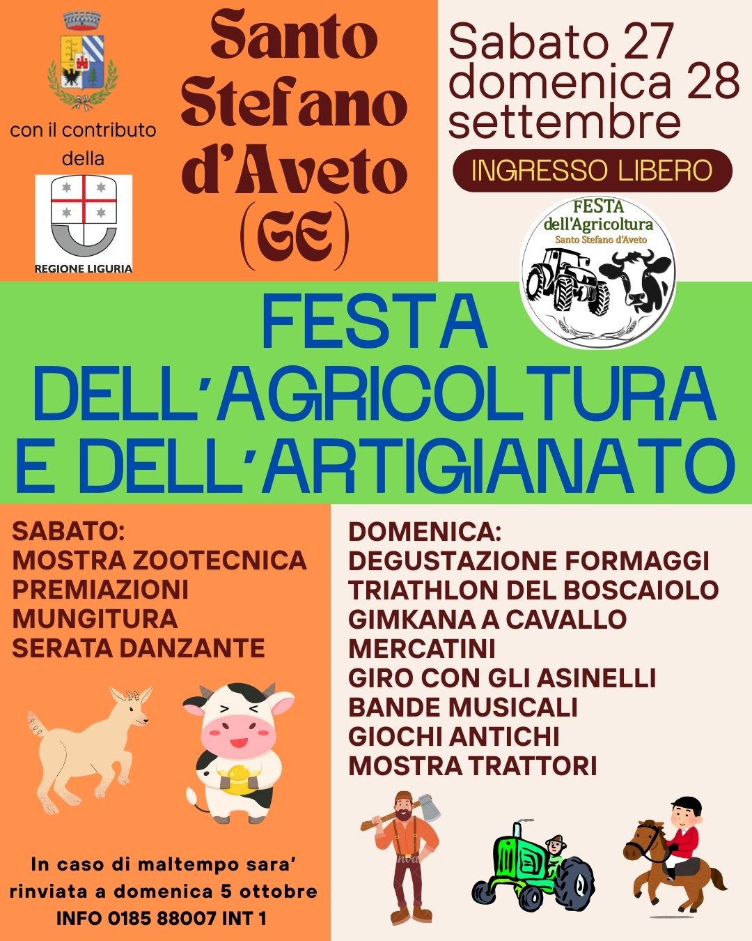 Il Comune di Santo Stefano d’Aveto, con il contributo della Regione Liguria, è lieto di invitare cittadini e visitatori alla tradizionale Festa dell’Agricoltura e dell’Artigianato, un appuntamento che celebra le radici, i mestieri e i sapori del nostro territorio.