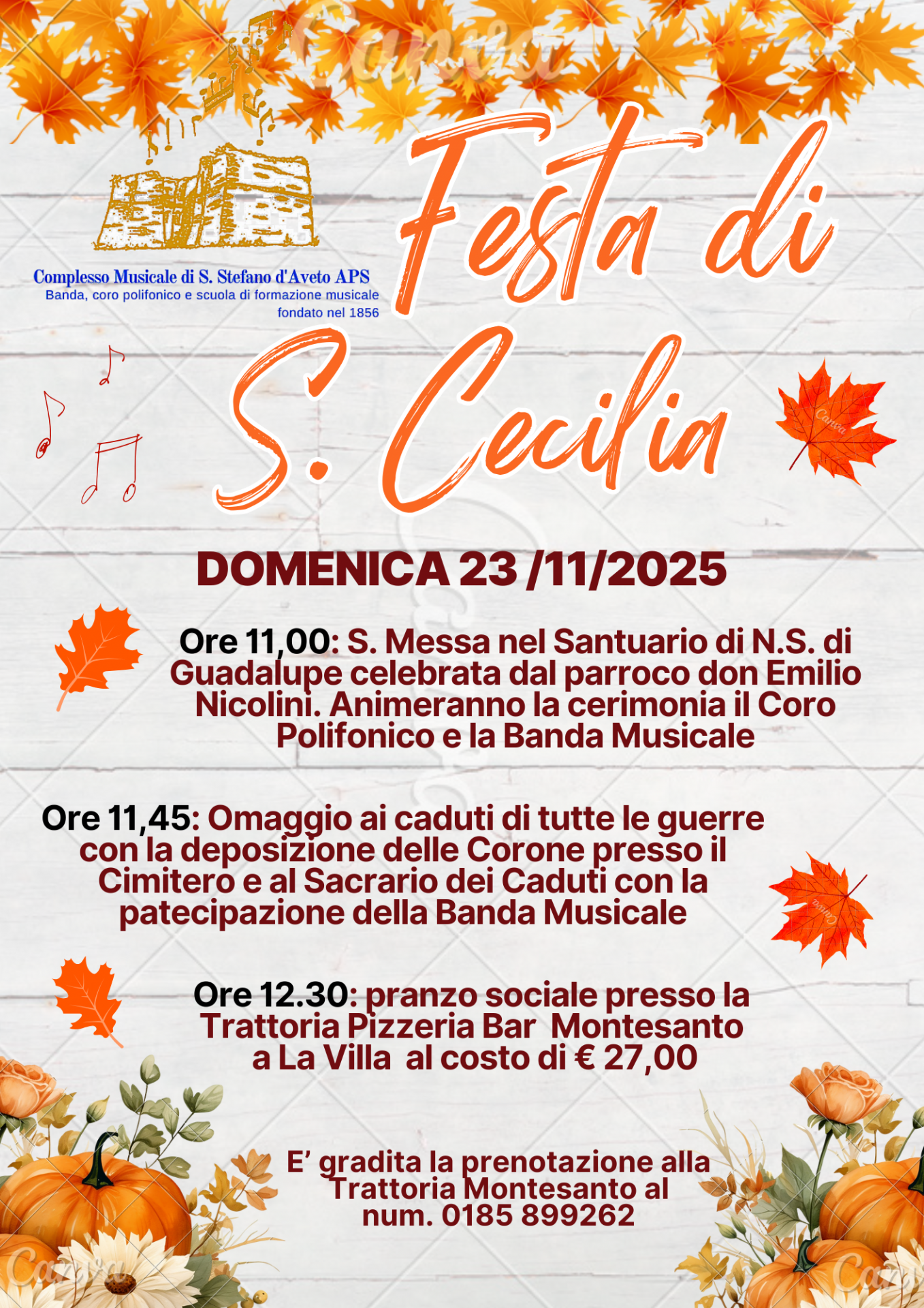 Il Complesso Musicale di S. Stefano d’Aveto APS invita tutta la cittadinanza, gli ospiti e gli amici a partecipare alla tradizionale Festa di Santa Cecilia, patrona della musica e dei musicisti.