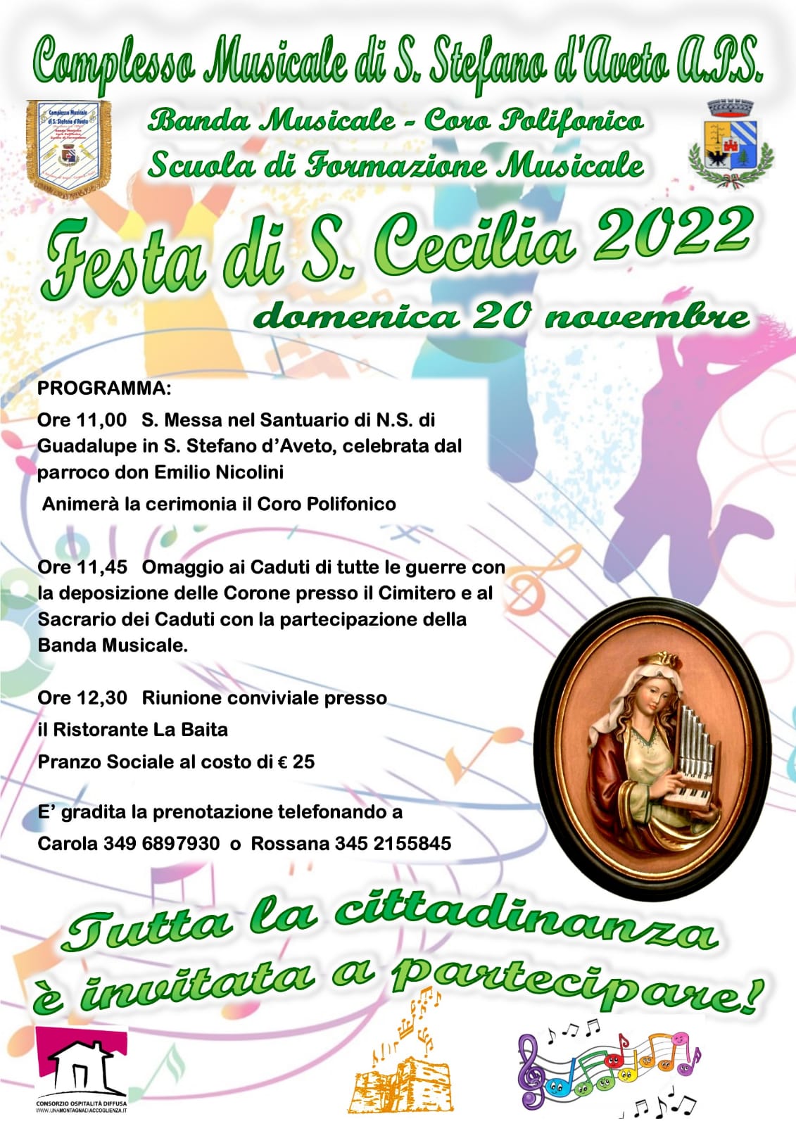 Domenica 20 novembre festeggeremo la patrona della musica, ci sarà la messa di ringraziamento, la deposizione delle corone e il pranzo al Ristorante La Baita.