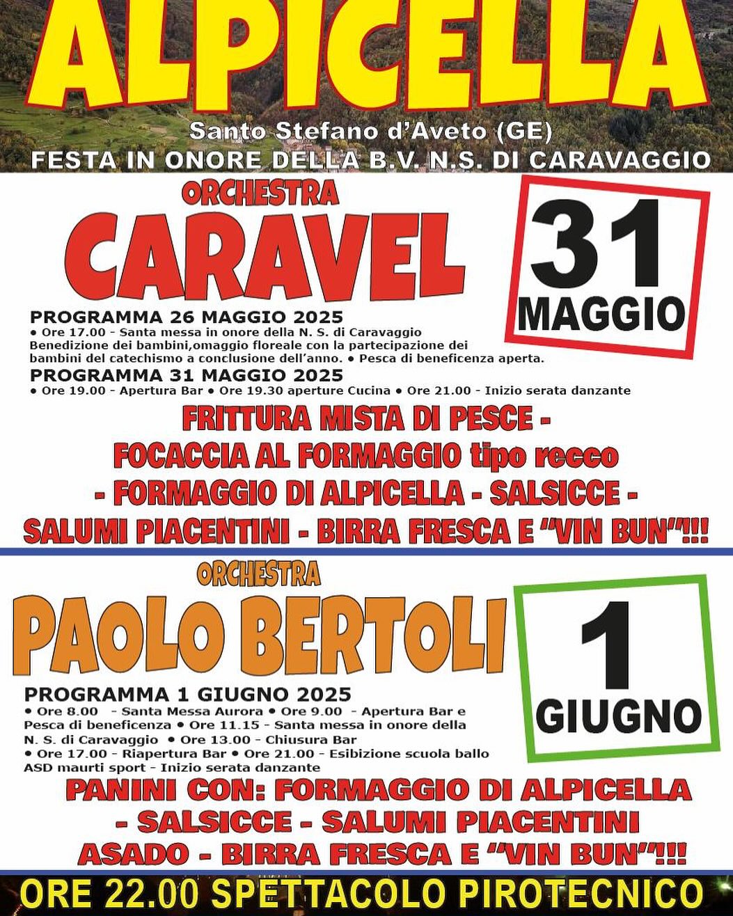L'Associazione Alpicella c'è è lieto di invitarvi alla tradizionale festa in onore della Beata Vergine N.S. di Caravaggio, che si terrà nella frazione di Alpicella nei giorni 26 maggio, 31 maggio e 1 giugno 2025.