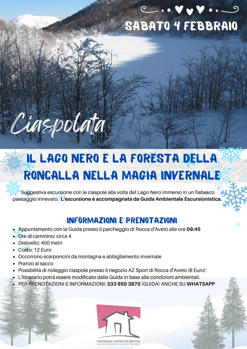 Suggestiva escursione con le ciaspole alla volta del Lago Nero immerso in un fiabesco paesaggio innevato.