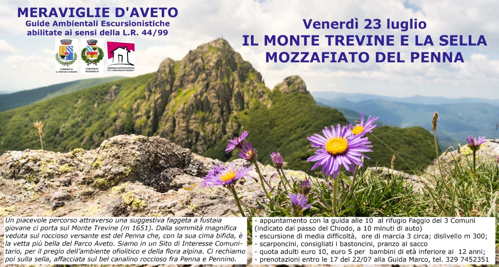 Un piacevole percorso attraverso una suggestiva faggeta a fustaia giovane ci porta sul Monte Trevine (1651 m slm) Dalla sommità magnifica veduta sul roccioso versante est del Monte Penna, che con la sua cima bifida, è la vetta più bella del Parco dell'Aveto. Siamo in un sito di interesse comunitario, per il pregio dell'ambiente ofiolitico e della flora alpina. Ci rechiamo poi sulla sella, affacciata sul bel canalino roccioso fra Penna e Pennino.