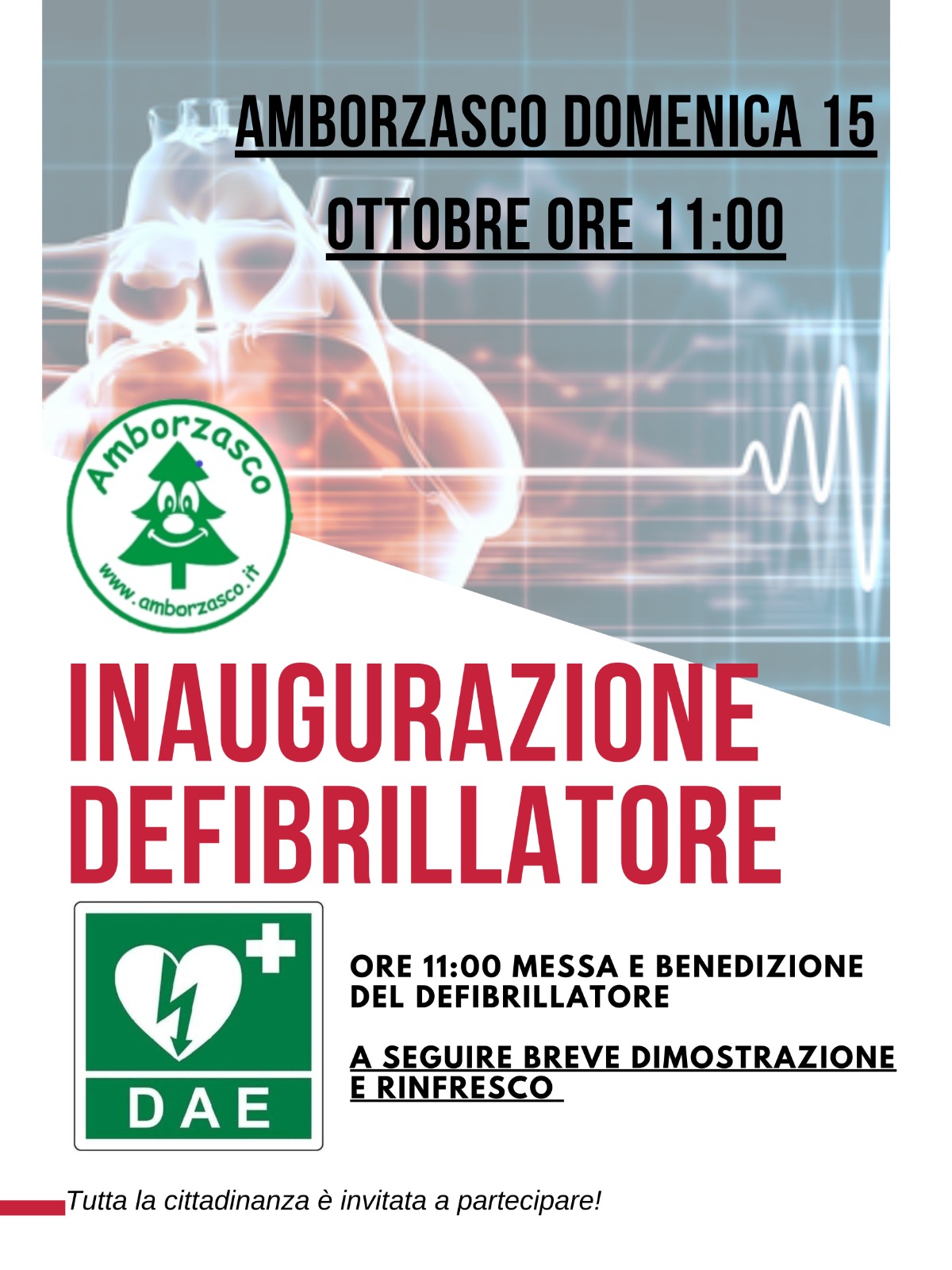 Domenica 15 ottobre 2023 ad Amborzasco, S. Messa ore 11 a seguire inaugurazione del DAE con breve dimostraizine e rinfresco!!!