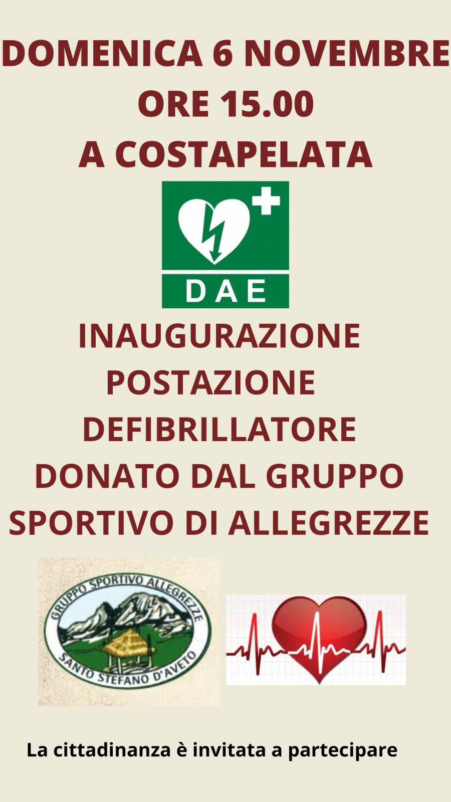 Il gruppo sportivo di allegrezze invita la popolazione all'inaugurazione della postazione DAE domenica 6 novembre alle ore 15 a Costapelata