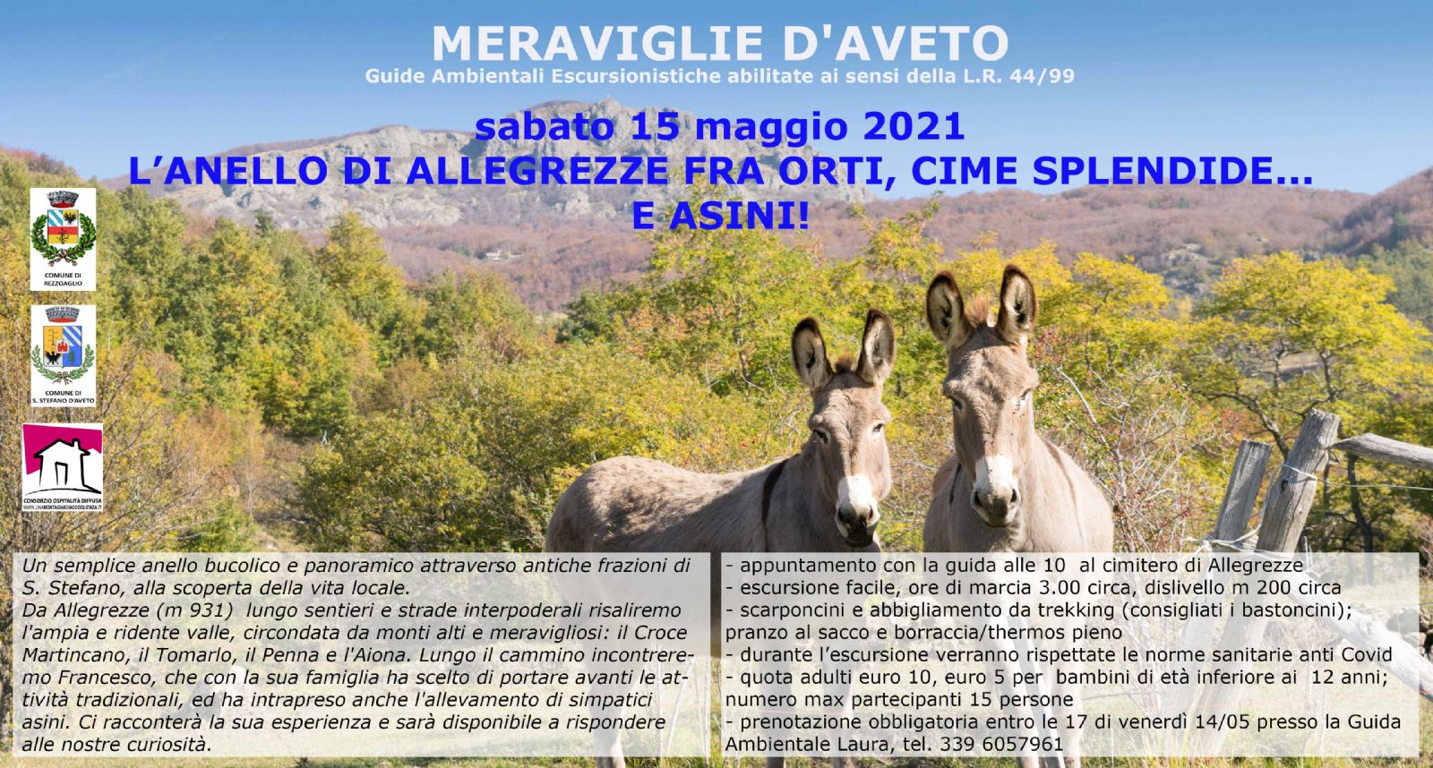 Un semplice anello bucolico e panoramico attraverso antiche frazioni di S. Stefano, alla scoperta della vita locale. Da Allegrezze (m 931) lungo sentieri e strade interpoderali risaliremo l'ampia e ridente valle, circondata da monti alti e meravigliosi: il Croce Martincano, il Tomarlo, il Penna e l'Aiona.