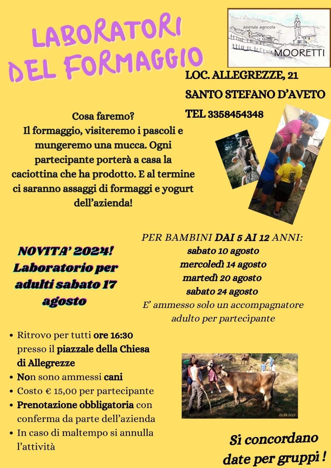 I bambini di età compresa tra i 5 ai 12 anni potranno imparare a fare il formaggio , a mungere una mucca e visiteranno i pascoli. Ognuno si porterà a casa la caciottina che ha prodotto, al termine ci saranno assaggi di formaggi e yogurt dell'azienda.