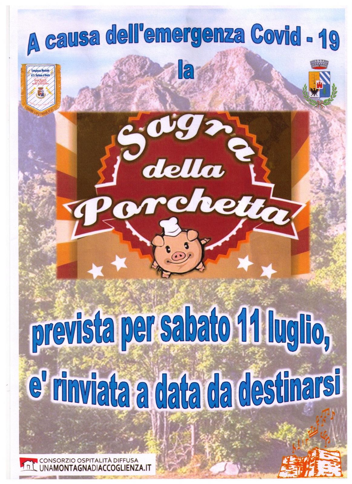 A causa dell'emergenza Covid19, la sagra della porchetta prevista per sabato 11 luglio a cura del Complesso Musicale è rinviata a data da destinarsi.
