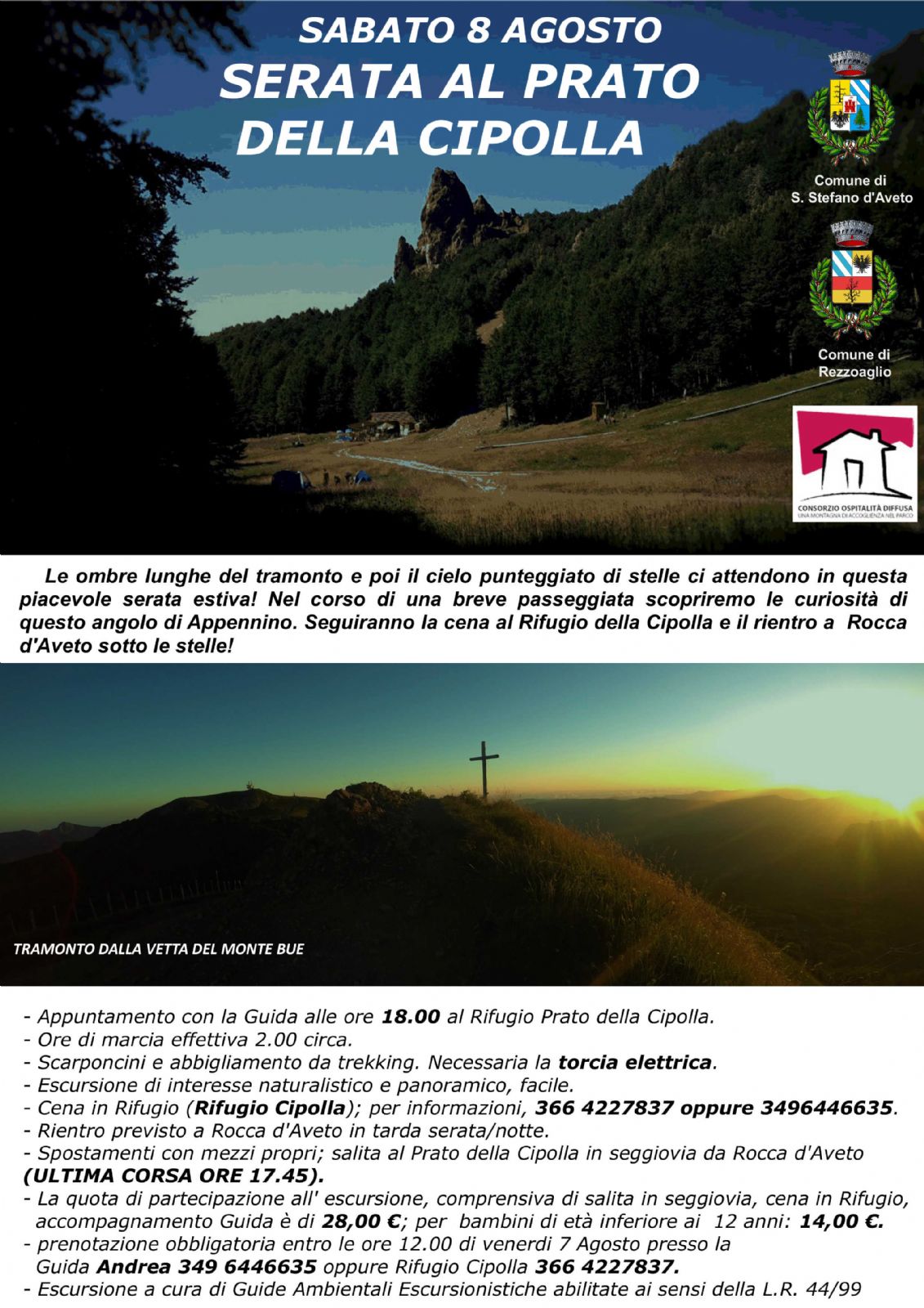 Quota comprensiva di escursione, salita in seggiovia, cena al rifugio, accompagnamento della guida, è di €28,00, per i bambini di età inferiore al 12 anni € 14.00.