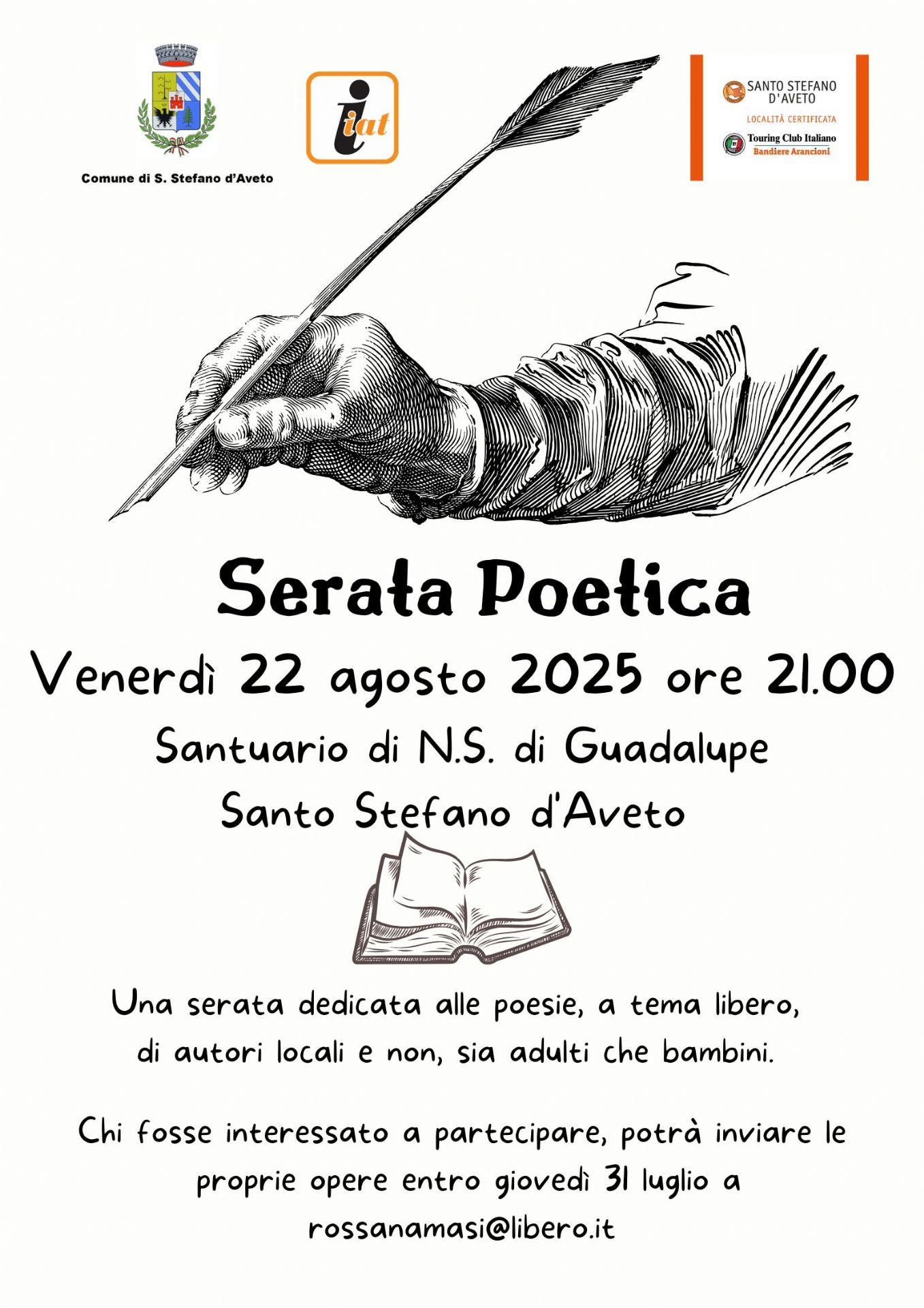 Dopo un anno di assenza, il Comune di Santo Stefano d’Aveto è lieto di invitare cittadini, turisti e appassionati di letteratura alla Serata Poetica, in programma venerdì 22 agosto 2025 alle ore 21:00 presso il Santuario di N.S. di Guadalupe.