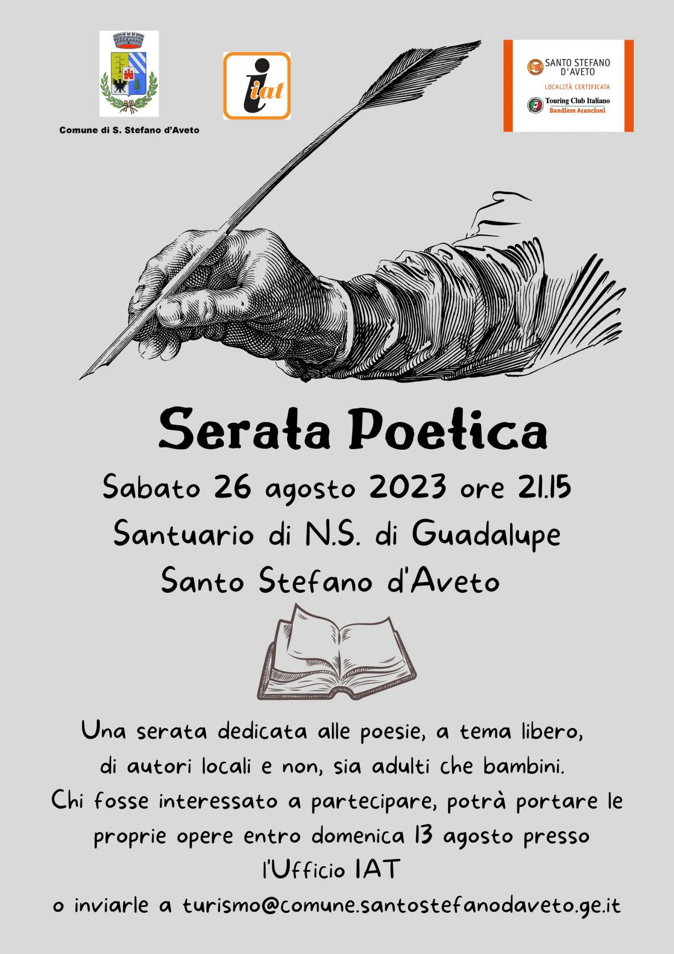 Anche quest'anno proporremo la serata poetica che si terrà sabato 26 agosto, la vigilia del Pellegrinaggio sul Monte Maggiorasca, all'interno del Santuario di NS di Guadalupe.
