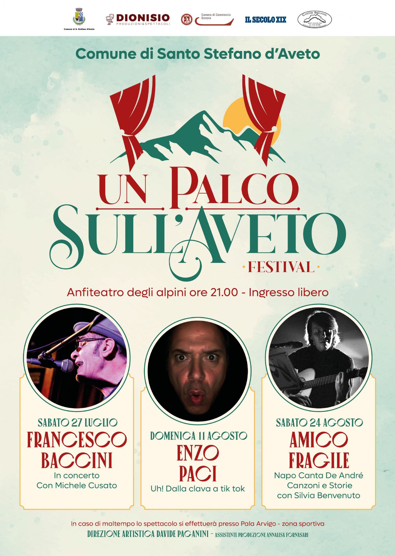Tre imperdibili serate a Santo Stefano d'Aveto, tre grandi artisti si esibiranno nell'anfiteatro, parco degli alpini dalle ore 21.00. Ingresso libero