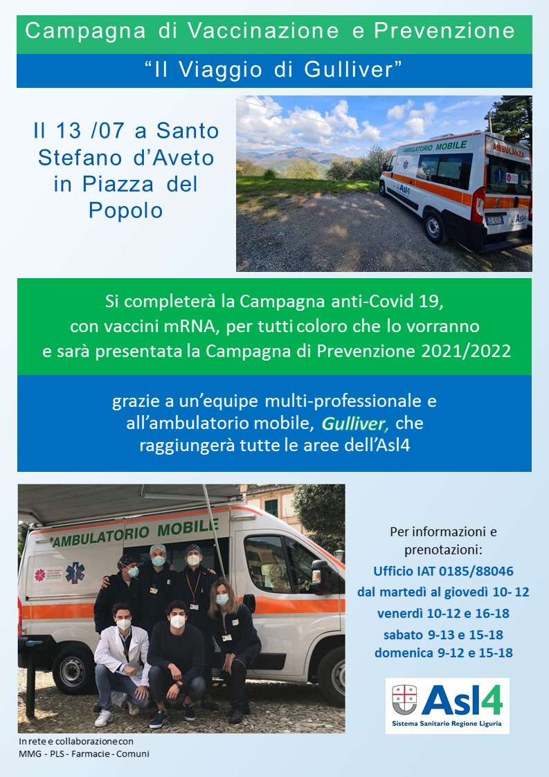 Si informa la cittadinanza che l'ASL 4 Chiavarese sarà presente a Santo Stefano d'Aveto, con un ambulatorio mobile il giorno 13 luglio per la campagna anti-Covid 19 con vaccini a mRNA.