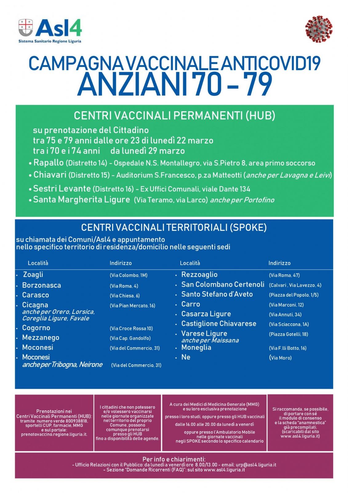 Gli Operatori della ASL 4 cureranno la prenotazione della vaccinazione tramite una chiamata telefonica individuale a tutti i cittadini tra 79 e 70 anni domiciliati presso i diversi Comuni una settimana prima della data prevista.
