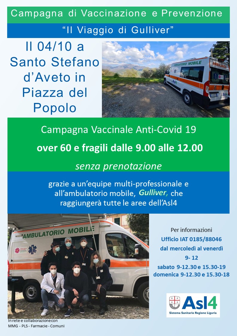 Martedì 4 ottobre dalle ore 9 alle ore 12 saranno presenti a S. Stefano d'Aveto gli infermieri di comunità per la campagna vaccinale covid 19 over 60 e persone fragili.