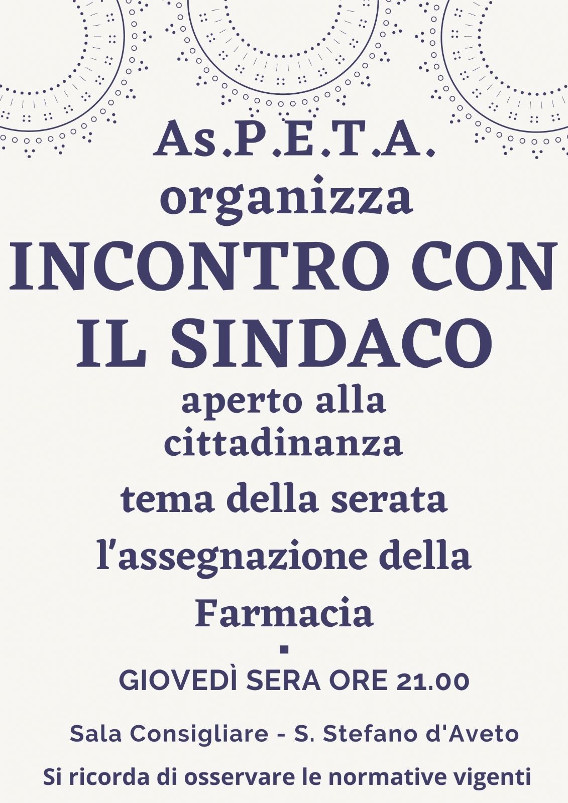 As.P.E.T.A. organizza un incontro con il sindaco aperto alla cittadinanza, tema della serata, l'assegnazione della farmacia, giovedì 14 aprile ore 21.00 presso la sala consigliare.