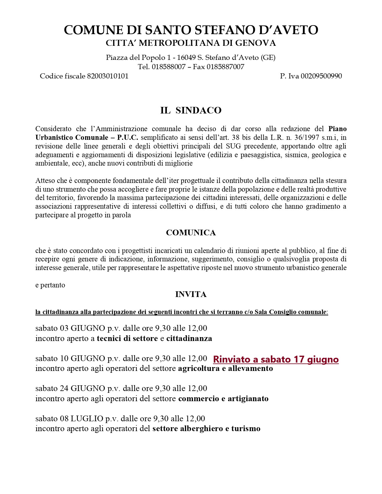 sabato 10 GIUGNO p.v. dalle ore 9,30 alle 12,00 - Rinviato a sabato 17 giugno