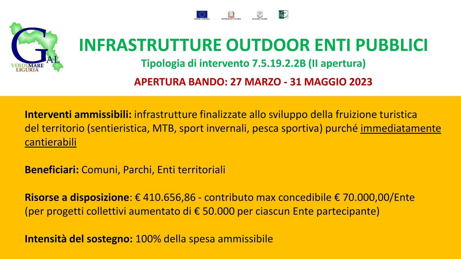 7.5.19.2.2B – Interventi di completamento delle infrastrutture turistiche e ricreative per la fruizione del comprensorio turistico outdoor – enti pubblici (II apertura), disponibile al seguente link