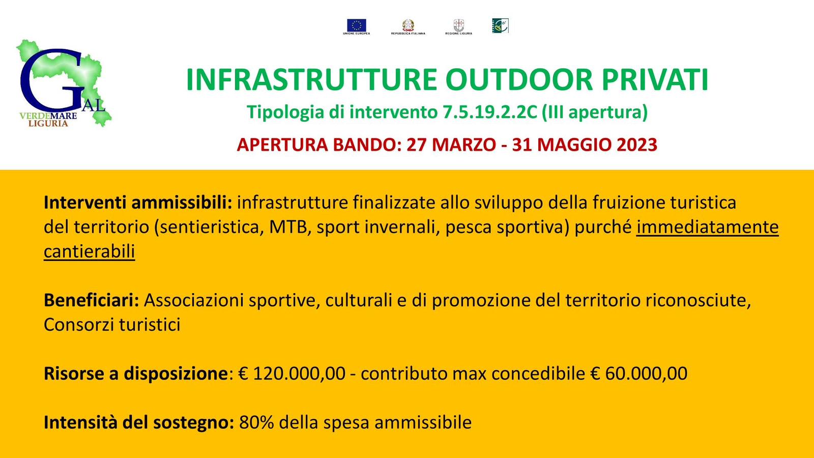 7.5.19.2.2C – Interventi di completamento delle infrastrutture turistiche e ricreative per la fruizione del comprensorio turistico outdoor – privati (III apertura), disponibile al seguente link