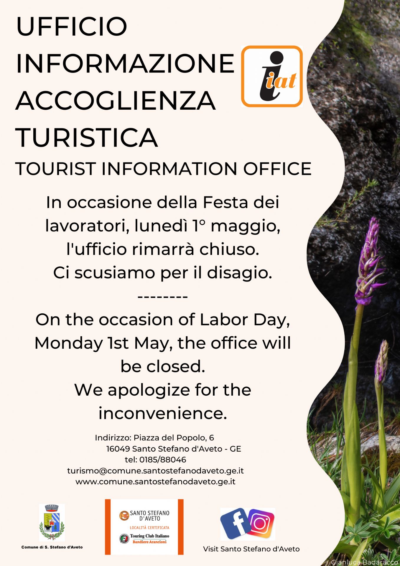 In occasione della Festa dei lavoratori, lunedì 1° maggio, l'ufficio rimarrà chiuso.