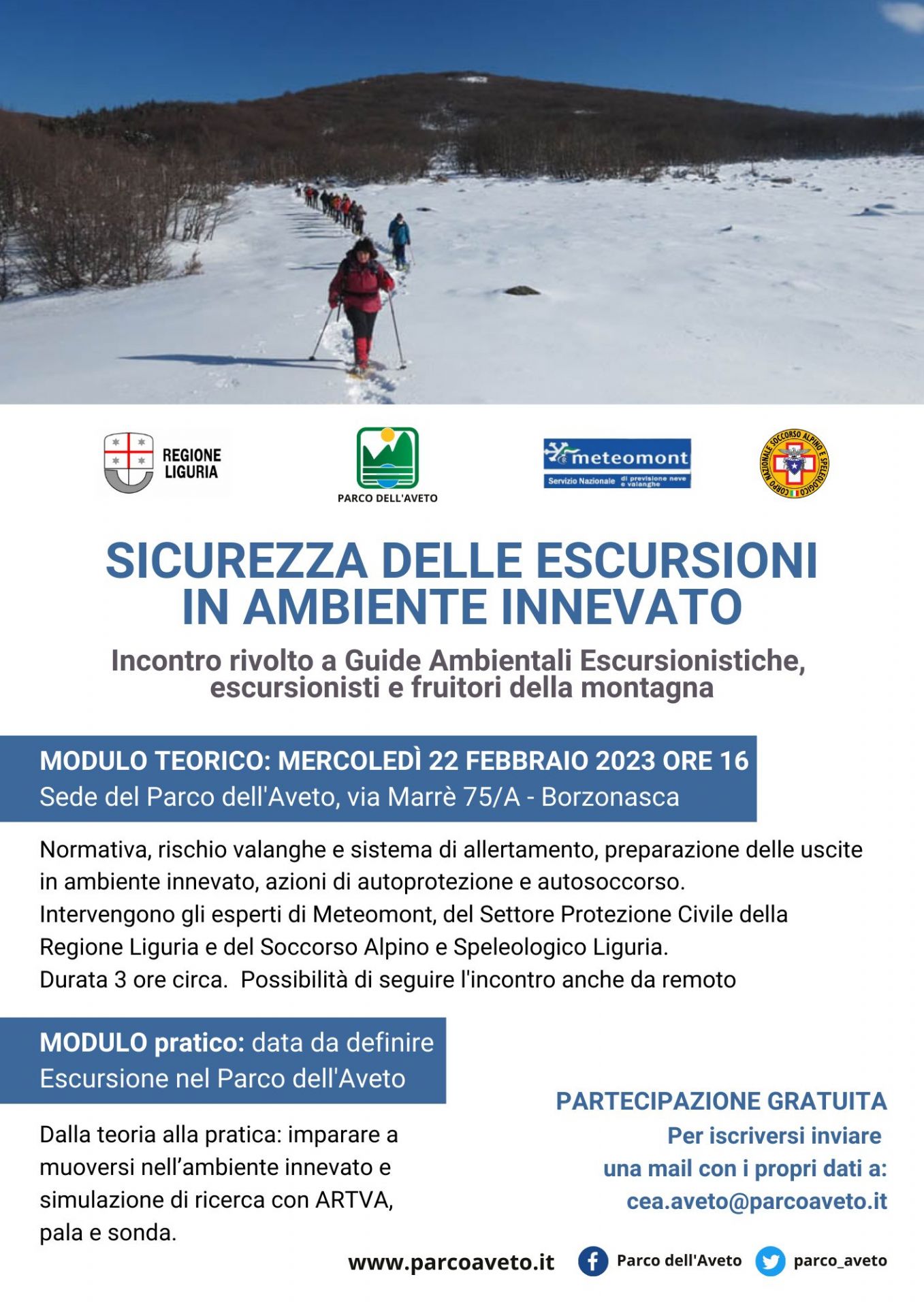 Il CEA del Parco dell’Aveto organizza un incontro sulla sicurezza delle escursioni in ambiente innevato il giorno 22 febbraio alle ore 16.00 presso la sede del Parco dell’Aveto in via Marrè 75/A a Borzonasca (GE).