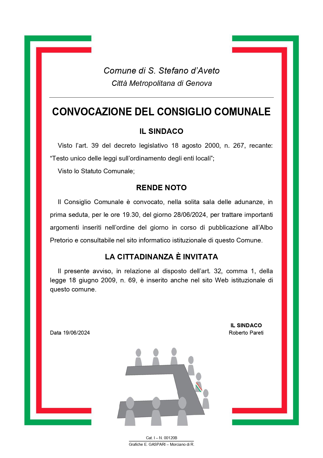 Il Consiglio Comunale è convocato, nella solita sala delle adunanze, in prima seduta, per le ore 19.30, del giorno 28/06/2024, per trattare importanti argomenti inseriti nell’ordine del giorno in corso di pubblicazione all’Albo Pretorio e consultabile nel sito informatico istituzionale di questo Comune.