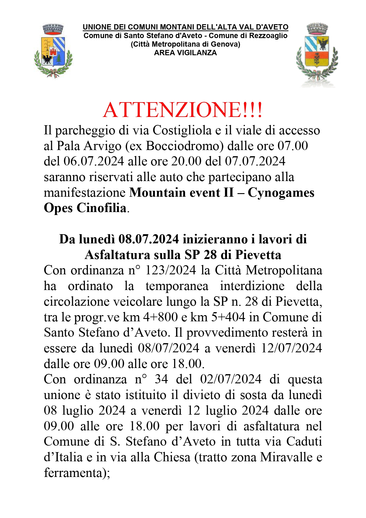 Il parcheggio di via Costigliola e il viale di accesso al Pala Arvigo (ex Bocciodromo) dalle ore 07.00 del 06.07.2024 alle ore 20.00 del 07.07.2024 saranno riservati alle auto che partecipano alla manifestazione Mountain event II – Cynogames Opes Cinofilia.