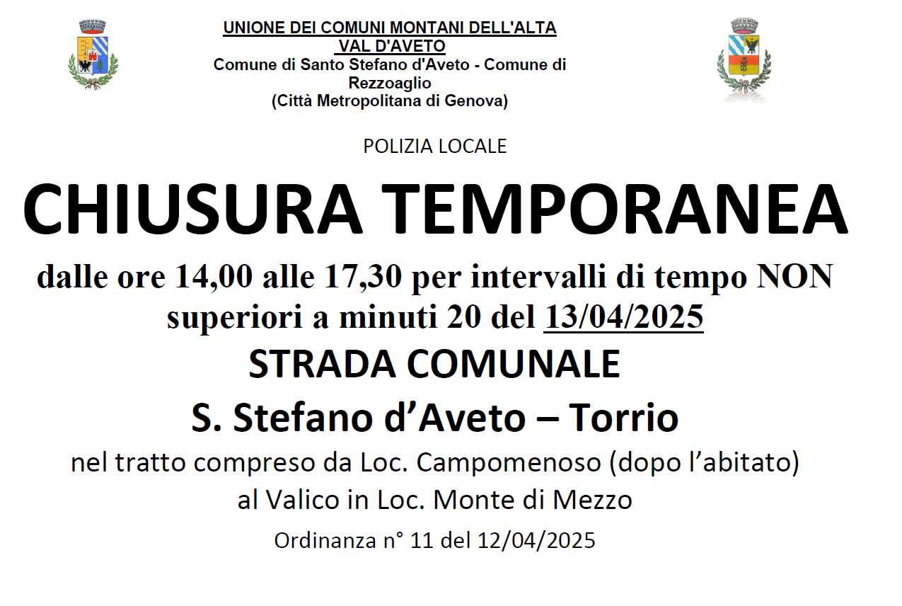 Si informa che è prevista la chiusura temporanea della strada comunale S. Stefano d’Aveto – Torrio nella giornata di domenica 13 aprile 2025, nella fascia oraria 14:00 – 17:30,