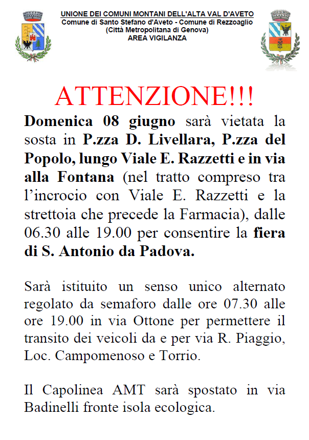 Domenica 08 giugno sarà vietata la sosta in P.zza D. Livellara, P.zza del Popolo, lungo Viale E. Razzetti e in via alla Fontana (nel tratto compreso tra l’incrocio con Viale E. Razzetti e la strettoia che precede la Farmacia), dalle 06.30 alle 19.00 per consentire la fiera di S. Antonio da Padova.