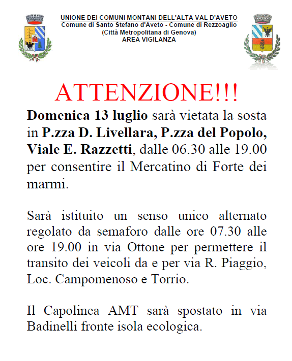 Domenica 13 luglio sarà vietata la sosta in P.zza D. Livellara, P.zza del Popolo, Viale E. Razzetti, dalle 06.30 alle 19.00 per consentire il Mercatino di Forte dei marmi.