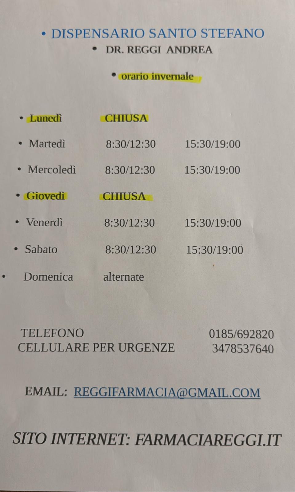 Si allega l'orario invernale del dispensario farmaceutico di S. Stefano d'Aveto