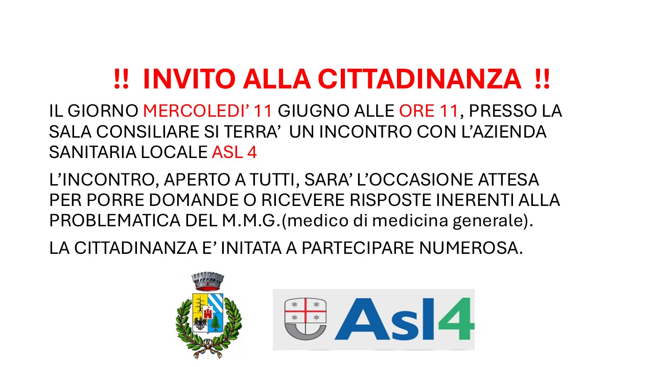 L'Amministrazione Comunale invita tutta la cittadinanza a partecipare all'incontro pubblico con l'Azienda Sanitaria Locale ASL 4, che si terrà mercoledì 11 giugno alle ore 11:00 presso la sala consiliare